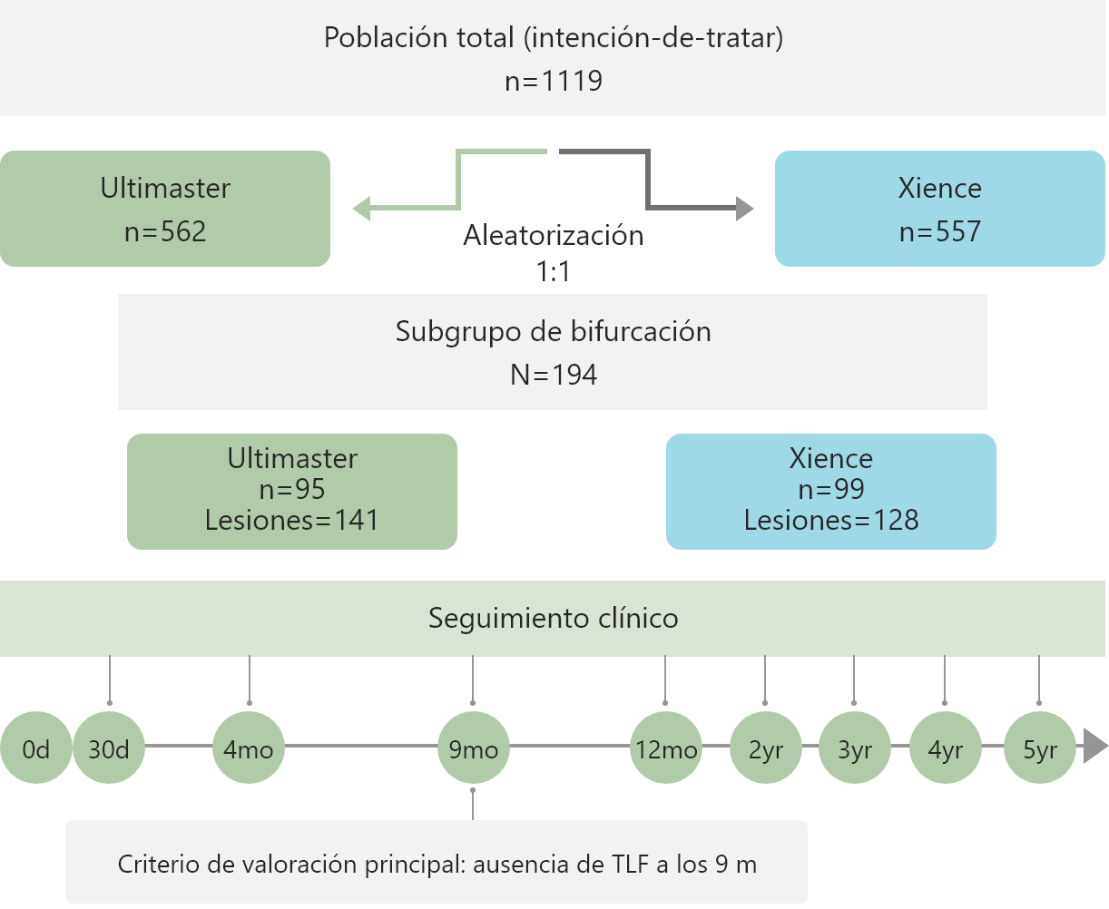 - La tendencia favorable del TLF en el subgrupo de la bifurcación verdadera, observada en los pacientes tratados con Ultimaster-DES, justifica una exploración adicional en cohortes más amplias.